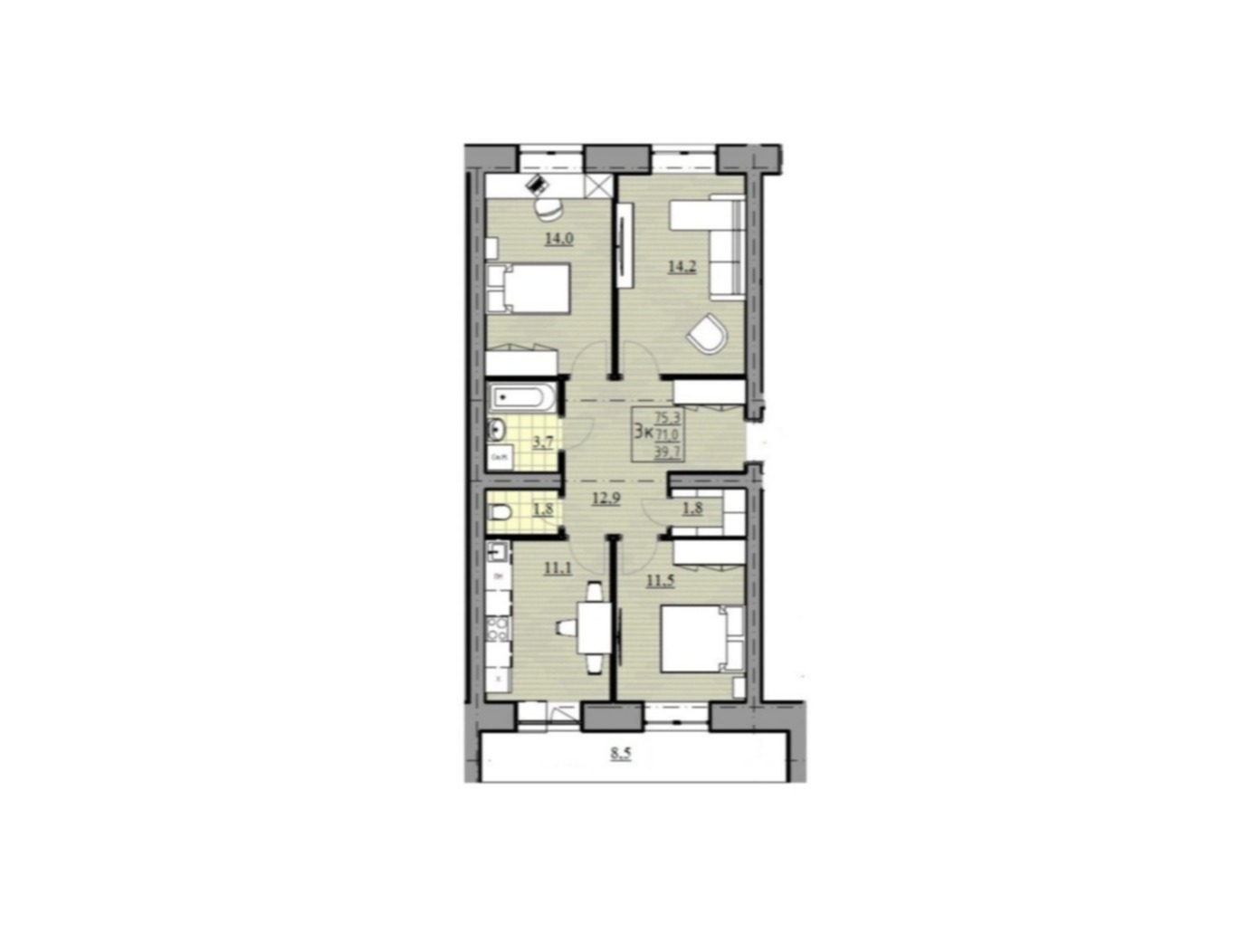 Застройщик реализует 3- комнатную квартиру, которая включает в себя: кухню, две спальни, гостиную, прихожую, туалет, ванную комнату, кладовую комнату, лоджию. Квартира выполнена в чистовой отделке. Чистовая отделка включает в себя: